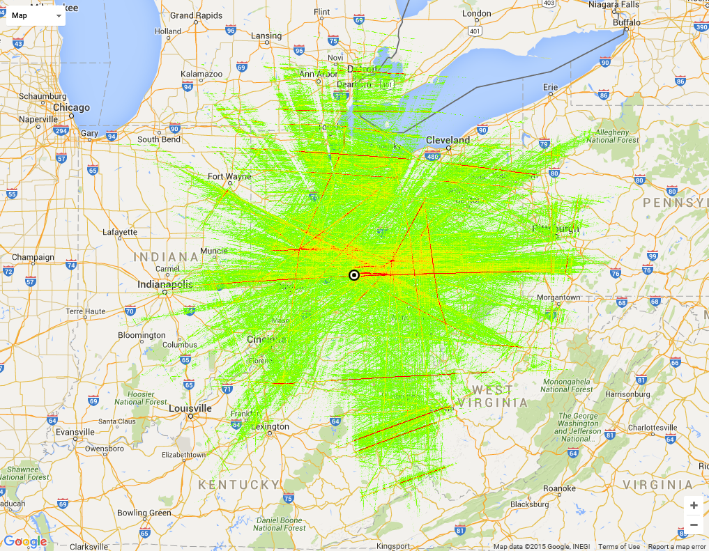 One week of data. I bumped the resolution up to 4000 from 1000 and the max points up to 4,000,000 from 400,000. The heatmap makes it obvious where the obstructions are around my antenna. Need another 20â above current location on the roof.