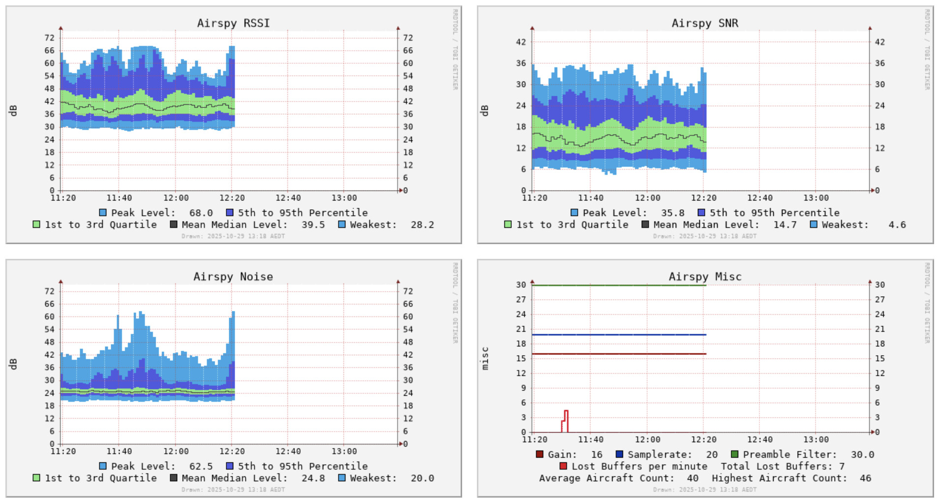 The following charts show a two hour window swapping from airspy_adsb to stream1090 at 12:22 local time.